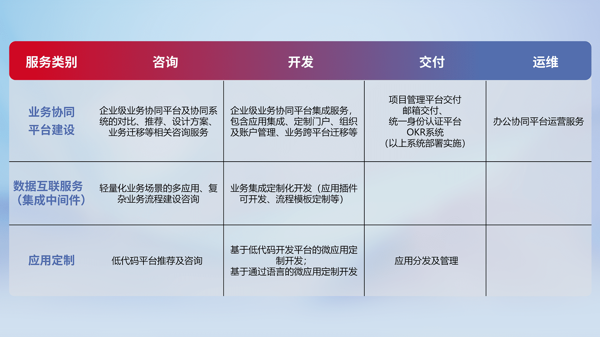针对钉钉、、、、企微、、、IDaas等平台级产品提供产品的规划、、方案、、交付、、、定制化开发等服务,,,实现如统一协同办公、、、、智能客户服务、、、混合会议管理、、、智能数据查询、、等业务场景,,,,实现数字化转型。。。