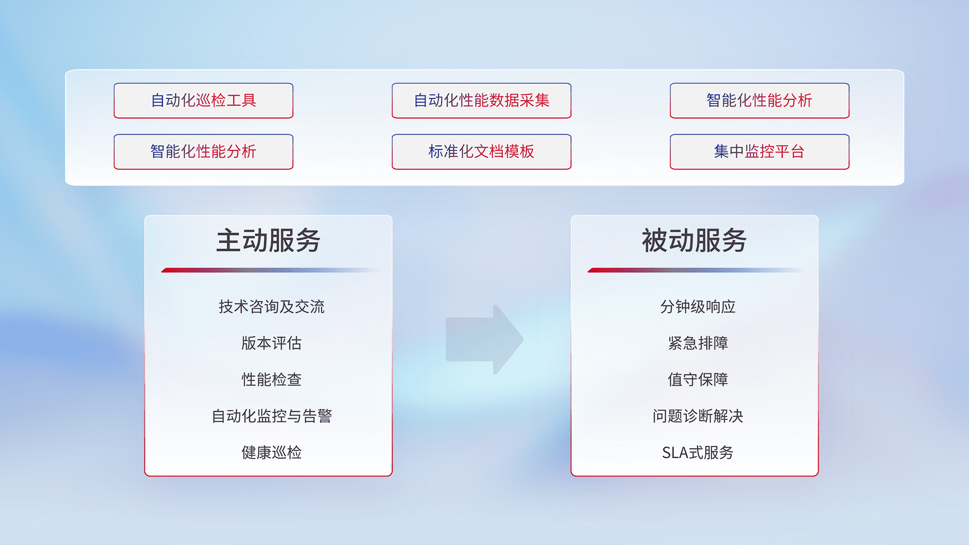 智能化工具和标准化文档,,,保障服务质量,,,,提供主动服务(包含技术咨询、、、、版本评估、、、性能检查、、、、自动化监控与告警、、、、健康巡检)和被动服务包含(分钟级响应、、、、紧急排障、、值守保障、、、问题诊断解决、、、、SLA服务)。。。。